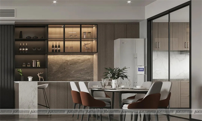 客餐廳一體化設(shè)計讓空間看起來簡約大氣,也增加了家人們的互動感,餐邊柜搭配小吧臺,形成一個功能緩沖區(qū),兼具實用及美觀